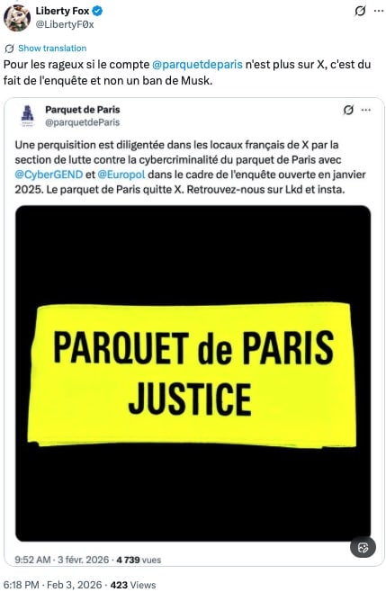 Ka Musk kritiseeris Prantsuse ametivõimude reidi ja kirjutas: „See on poliitiline rünnak.” Viidates teisele postitusele, mis käsitles jõhkrat lapse vägistamist, tõdes Musk, et Prantsusmaa ametivõimud peaksid pigem keskenduma seksuaalkurjategijate tabamisele.