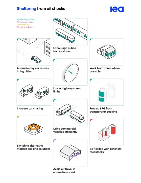 Rahvusvaheline energiaagentuur (International Energy Agency, IEA) soovitab liikmesriikidel rakendada meetmeid, millega kaitsta end kütusekriisi eest ning tulla toime üha tõusvate naftahindade ja tarneprobleemidega. Energiaagentuuri soovituste seas on kümme erakorralist meedet, mille hulgast leiab ka sõiduautoga liikumispiirangute kehtesamise, autode sõidukiiruse ja sõiduaja piirangud, aga ka soovituse eelistada kodukontorit ja kasutada gaasipliidi asemel elektripliiti.