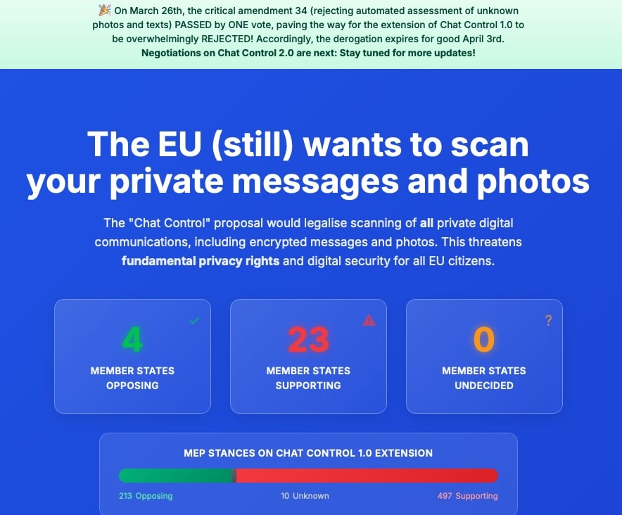 Euroopa Parlament hääletas 11. märtsil ajutise sõnumikontrolli pikendamise poolt kuni 3. augustini 2027, aga vaid tingimusel, et sõnumikontroll on kitsam. Parlament nõudis sihtotstarbelist tuvastust, krüpteeritud sõnumite kontrollimise keeldu ning et meedet rakendatakse vaid konkreetsete kahtlusaluste või rühmade korral. 26. märtsil lükkas parlament tagasi ka viimase hetke katse meedet pikendada ja see aegus 3. aprillil.